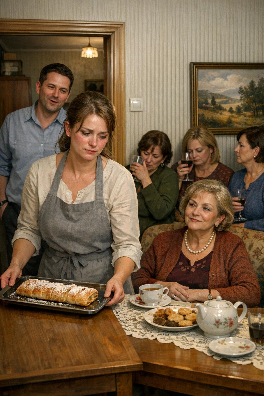 Stála som v priechode do obývačky s táckou v rukách; môj špeciálny štrúdel na nej už stihol vychladnúť. Za stolom sedeli tri kamarátky svokry — Dobromila Ivaničová, Klaudia Adamčíková a Viera Erdélyiová. So zdvihnutými pohármi strnulo mlčali a pohľadmi prechádzali odo mňa k Milade Ecksteinovej, mojej svokre, ktorá sedela na čele stola s výrazom ticheho triumfu.