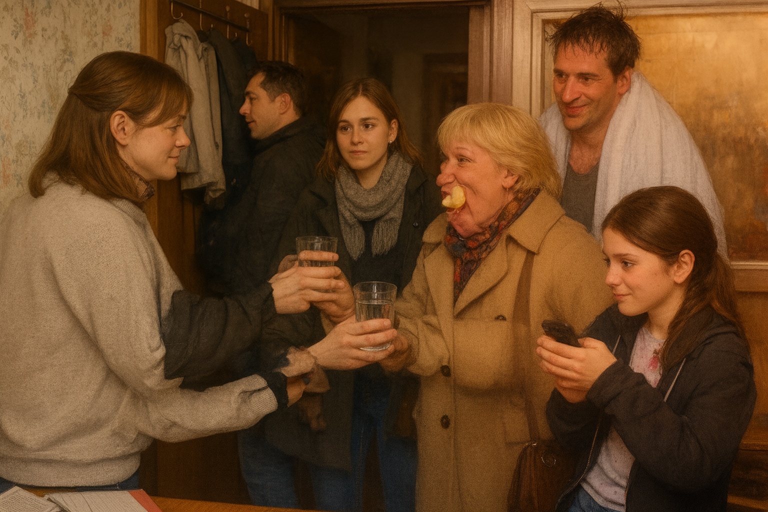Na prahu stála Helena Ambrusová, jej svokra, s výrazom, ktorý naznačoval dobrú náladu a očakávania. Po jej boku sa tlačila dcéra Lenka Lengyelová spolu s manželom Róbertom Vaškovičom a za nimi postávala ich pätnásťročná dcéra Klaudia Bodnárová, zabratá do mobilu.