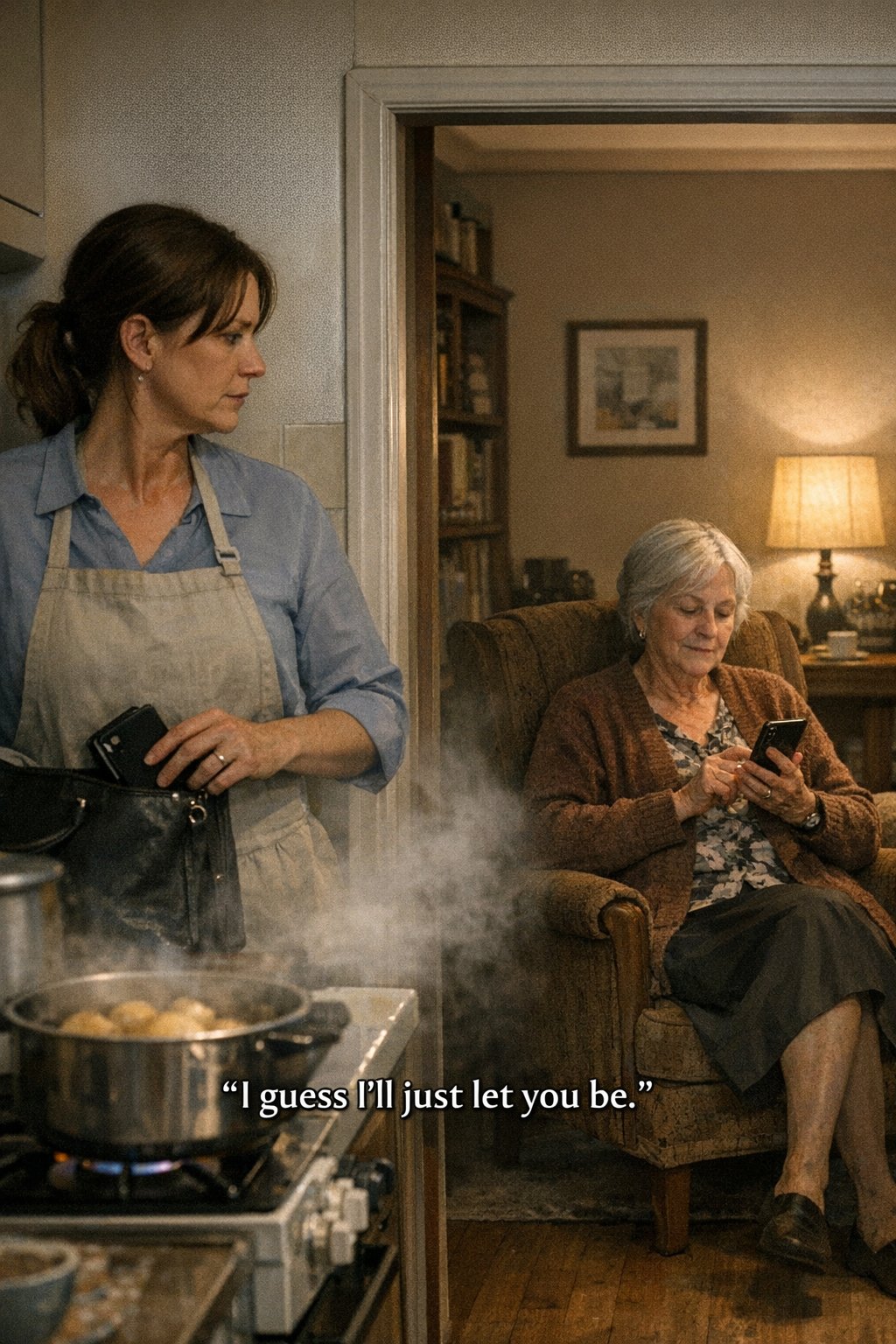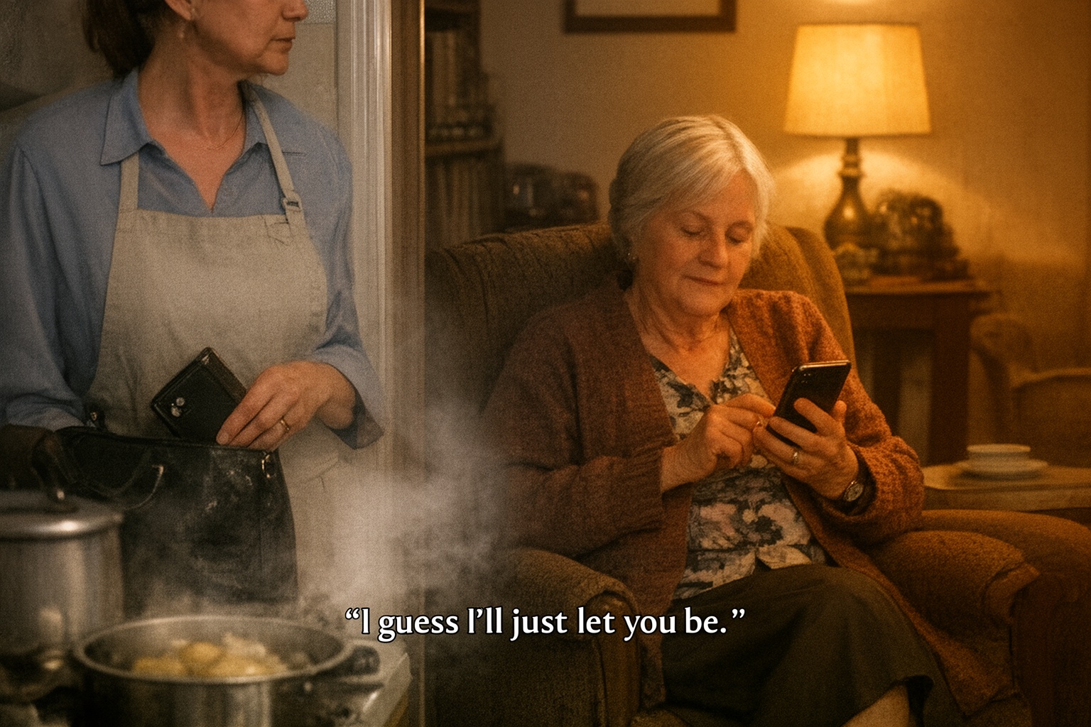 Adriana Uhrinová zasunula mobil späť do kabelky a pomaly sa vrátila do kuchyne. Zemiaky už bublali vo vriacej vode a para zahmlievala okno. V jedálni, len pár krokov od nej, sedela Otília Oláhová pohodlne usadená v kresle. V rukách držala Adrianin telefón.